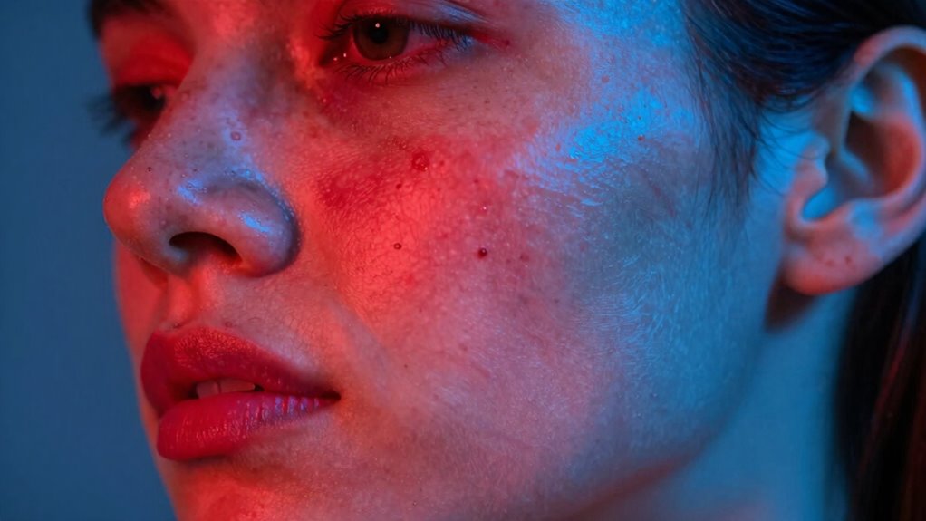 Red and blue light therapies target acne-causing bacteria and reduce inflammation. These treatments work by allowing light penetration to reach deeper layers of your skin. Blue light penetrates the skin surface to target bacteria that live on the skin’s surface and within hair follicles, effectively killing the bacteria responsible for breakouts. Blue light’s ability to selectively target bacteria without harming surrounding tissue makes it a popular choice for treating mild to moderate acne. Red light penetrates even deeper, reaching the dermis to stimulate cellular activity, promote healing, and calm inflammation. This skin penetration helps boost circulation and encourages tissue repair, reducing redness and swelling. As you undergo therapy, the light energy is absorbed by specific cellular components, triggering beneficial biological responses. Light penetration at different depths is essential for effective therapy, allowing targeted treatment of various skin layers. By carefully targeting these layers, red and blue light therapies efficiently combat acne at different depths, improving your skin’s overall health and appearance.