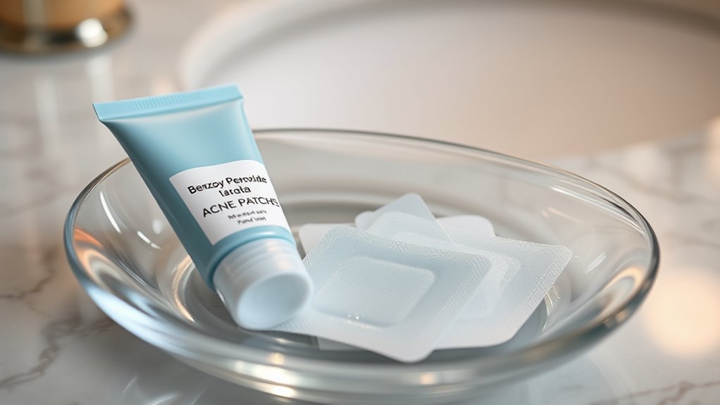 Combining benzoyl peroxide and acne patches as part of your treatment can enhance effectiveness by targeting acne from different angles. This combination therapy helps clear pores faster and reduces inflammation. However, you should be cautious about overuse, which can cause irritation. Always consult your dermatologist before combining these treatments to guarantee safety and optimize your acne management plan. Proper use can lead to better, quicker results.
