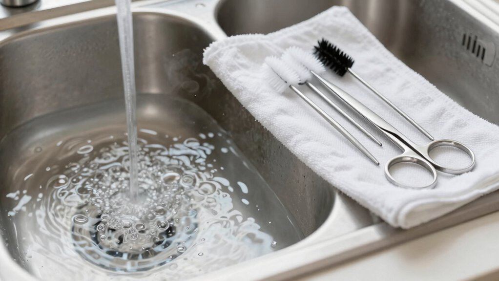 - Wash tools thoroughly with soap and water before sterilizing