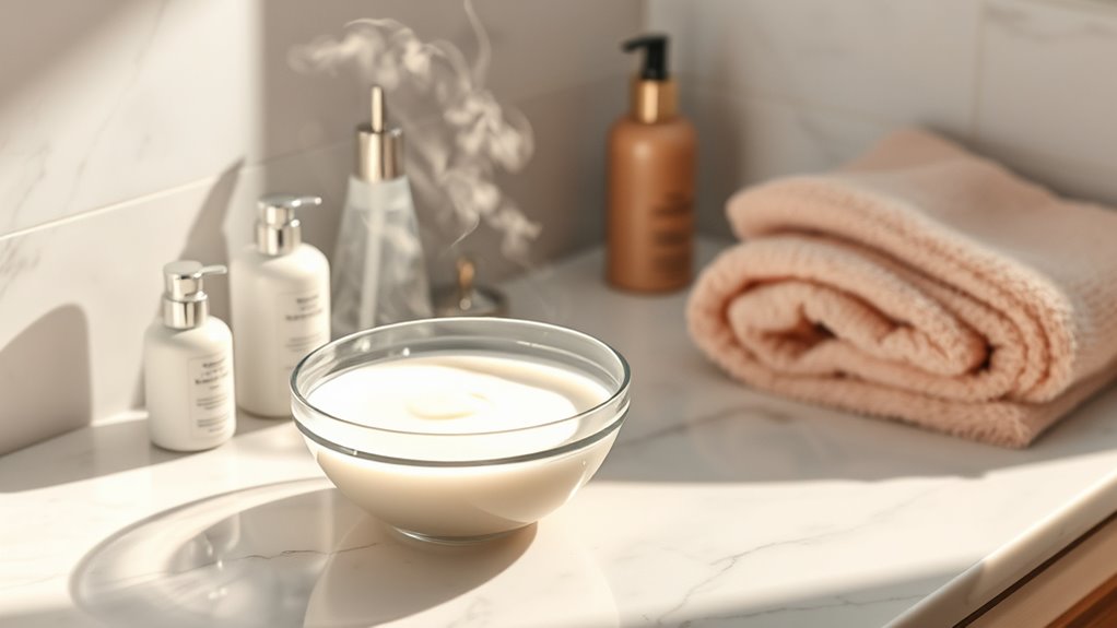 As you proceed, remember ingredient timing. If you’re using exfoliating acids like AHAs or BHAs, apply them after cleansing and before serums—never at the same time as active treatments that could irritate your skin. If your routine includes treatments like retinol, which can increase skin sensitivity, apply them after your serum and before moisturizer to give your skin time to absorb and benefit. Finish your routine with a nourishing moisturizer or face oil to seal everything in and provide overnight repair. Applying an oil or cream last creates a barrier that traps moisture, aiding in skin recovery. Consistency is key; sticking to this methodical approach each night guarantees your skin gets the proper care it needs to repair and renew itself while you sleep.