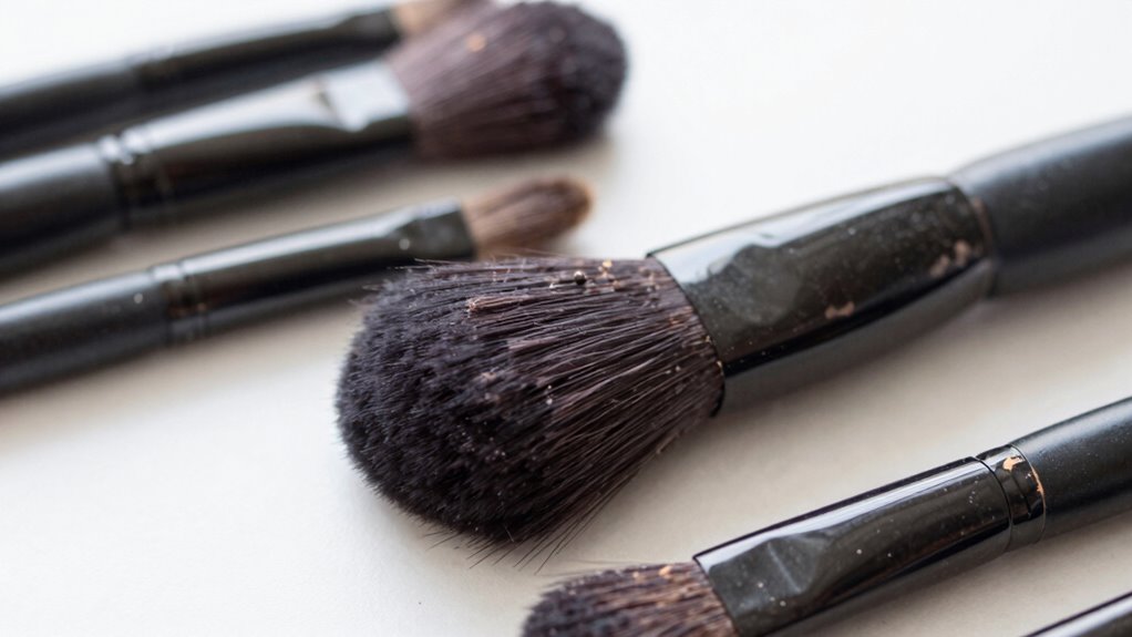 Dirt and bacteria often hide in the hard-to-reach space beneath the ferrule, making it easy for grime to accumulate unnoticed. This area is a common spot where poor brush hygiene leads to bacteria buildup, even after regular cleaning. This hidden spot can trap residue, oils, and dead skin cells, creating a perfect environment for germs. Because it’s difficult to see, you might think your brushes are clean when they’re not. Bacteria can thrive in this area, increasing the risk of skin breakouts and infections. Over time, residue, oils, and dead skin cells get trapped here, further contributing to bacterial growth. Regularly inspecting and addressing this area is essential for maintaining proper brush hygiene. If neglected, this hidden grime becomes a breeding ground for bacteria, defeating the purpose of cleaning your brushes altogether. In addition, understanding the essential oils for skin health can help you choose natural remedies to keep your skin protected from bacteria and infections. Incorporating proper cleaning techniques can ensure that every part of your brushes is thoroughly sanitized and free from harmful germs.