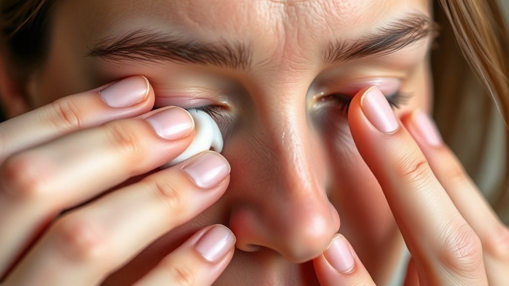 During allergy season, soothing your under-eye skin is key to reducing irritation, puffiness, and redness. Rinse your eyes with cold water or saline to flush out allergens, and apply a cold compress for quick relief. Use gentle remedies like cooled chamomile tea bags or aloe vera to calm inflammation. Keeping your environment allergen-free and staying hydrated also helps. For more tips on keeping your eyes comfortable and healthy, keep exploring these effective strategies.