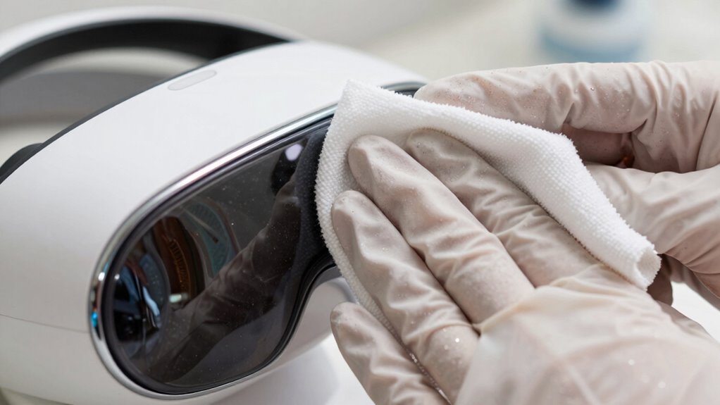 While daily cleaning keeps your eye devices safe for regular use, implementing a weekly deep clean is essential to eliminate buildup that regular routines might miss. During these deep cleans, follow strict sterilization protocols to ensure all bacteria and debris are thoroughly removed. This extra step helps prevent infection by targeting areas that daily wiping may overlook. Use appropriate cleaning solutions and sterilization techniques recommended for your specific devices, guaranteeing complete disinfection. Regular deep cleans also prolong the device lifespan of your eye devices and maintain ideal performance. Prioritizing this routine is crucial for infection prevention, especially when shared or used frequently. Consistent weekly deep cleans create a safer, healthier environment for your eyes, reducing the risk of complications over time. Proper sterilization is key to ensuring your devices remain safe and effective for daily use. Additionally, understanding device longevity can help you determine when professional servicing or replacement might be necessary.
