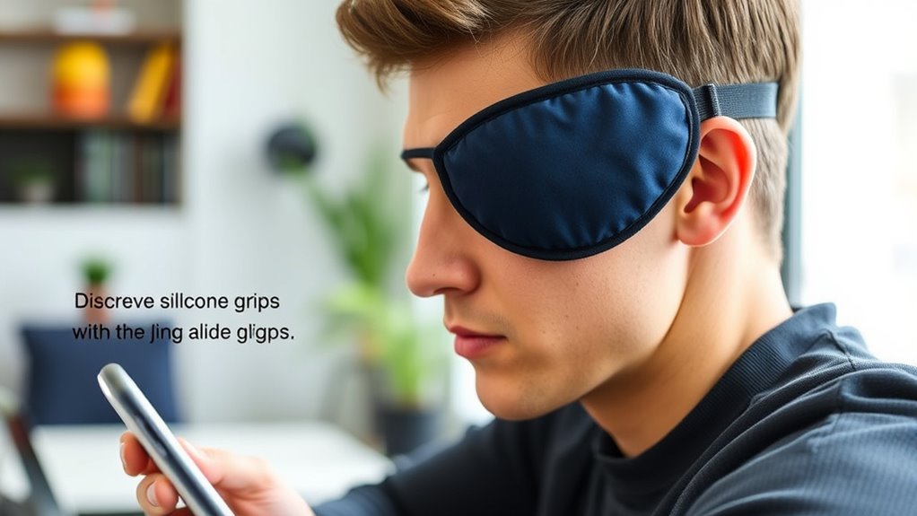 Certain fabrics can cause eye patches to slip more because of fabric compatibility issues. Smooth, slick materials like silk or satin tend to reduce grip, making patches more likely to slide. Conversely, rougher fabrics like cotton or fleece provide better traction. When choosing patch material, consider how it interacts with your skin and the fabric compatibility, ensuring a secure fit so you can multitask comfortably without constant readjustments.