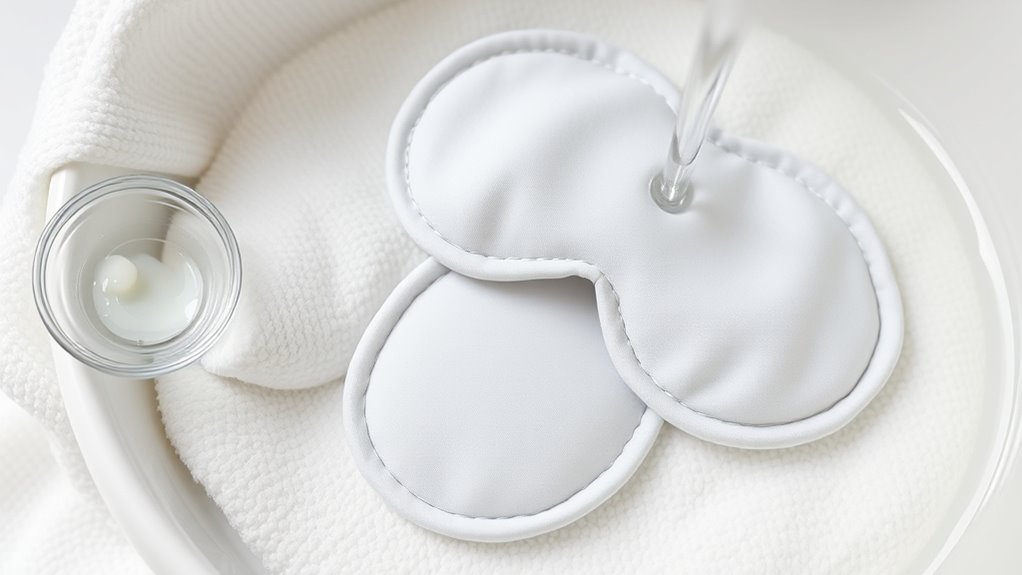 You should use gentle cleaning agents that are compatible with sensitive skin when cleaning your reusable eye patches. Avoid harsh chemicals, alcohol-based products, or strong fragrances, as they can irritate your skin. Instead, opt for mild, fragrance-free soap or a specialized skincare-compatible cleaner. Gently hand wash the patches, rinse thoroughly, and air dry to maintain their integrity and guarantee they remain safe for sensitive skin.