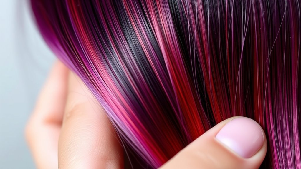 To prevent color fading and boost color longevity, you should use sulfate-free shampoos and conditioners designed for color-treated hair. Wash your hair with cool water to seal the cuticle, reducing fade prevention issues. Limit washing frequency, and always protect your hair from sun exposure and heat styling. Regular deep conditioning treatments also help maintain vibrancy, ensuring your color stays bright and fresh longer.