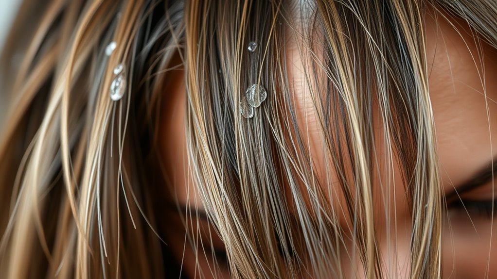 If you notice your hair feels heavy, looks dull, and tangles easily, hard water may be the cause. Mineral buildup roughs up your hair cuticles, making it brittle and less soft after washing. You might see increased frizz or roughness and find your usual products less effective. To fix this, consider using chelating shampoos, installing water softeners, and deep conditioning regularly. Keep going to discover more ways to protect your hair from hard water damage.