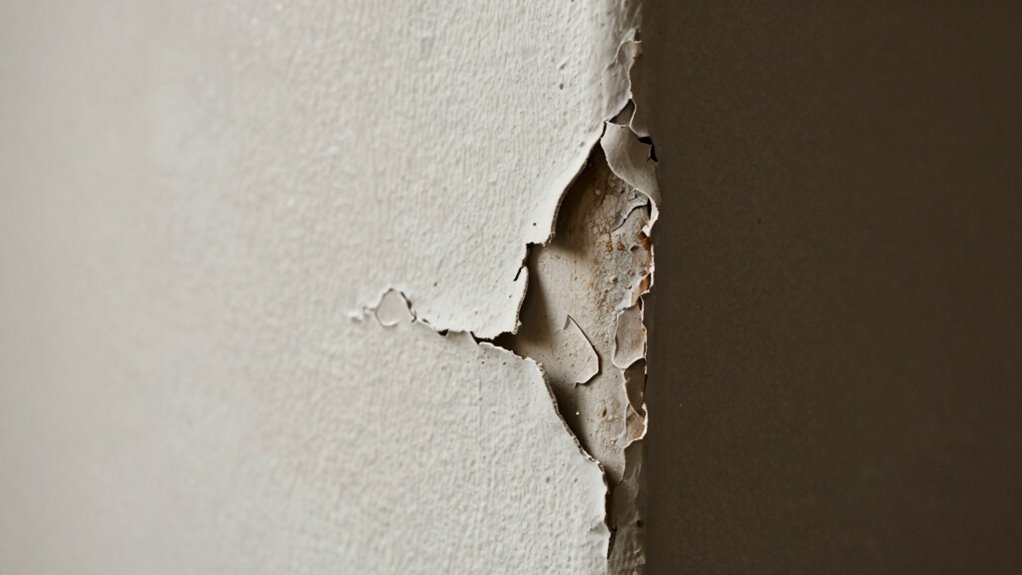 Patch corners peel first because they’re areas of natural stress and are more exposed to damage. Poor surface preparation, like not cleaning or sanding properly, weakens paint adhesion at these points. Additionally, improper installation and environmental factors, such as humidity and temperature, can accelerate peeling. To prevent this, guarantee thorough prep, use high-quality primer, and apply thin, even coats of paint. Keep exploring to discover more tips for long-lasting drywall repairs.