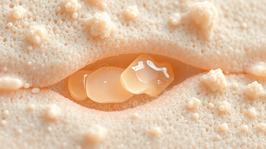 Ceramides play a vital role in strengthening your skin’s moisture barrier, acting like natural glue that holds skin cells together. They help prevent water loss, protect against environmental stressors, and reduce irritation. As you age or face harsh conditions, ceramide levels can drop, weakening your barrier. Replenishing these lipids can restore your skin’s resilience and improve hydration. Keep exploring to discover how maintaining ceramide levels keeps your skin healthy and protected.