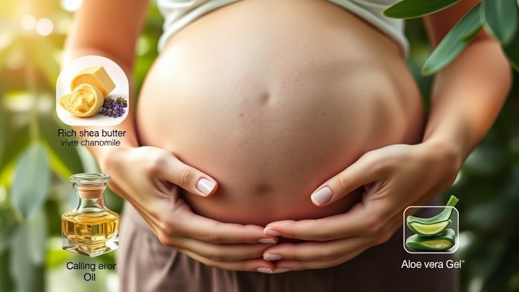 When building your skincare routine during pregnancy, focus on products with natural ingredients known for their soothing and nourishing properties. Look for gentle cleansers that avoid harsh chemicals and fragrances, helping to prevent irritation. Incorporate moisturizers with ingredients like shea butter, coconut oil, or aloe vera, which hydrate your skin naturally and reduce the appearance of stretch marks. These ingredients not only nourish your skin but also promote elasticity, which can be beneficial as your body changes. For targeted treatments, consider natural options like vitamin E oil or cocoa butter, which are often used to improve skin elasticity and diminish scars or stretch marks over time.