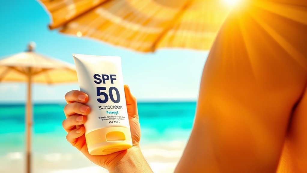 Oh, the irony—water-resistant sunscreen promises waterproof durability, yet many find their swimming sunscreen fades faster than expected. During swimming, your actual sun protection depends heavily on this feature. It’s designed to stay on longer, but prolonged immersion can still weaken its barrier. So, if you want reliable coverage, choose a high-quality, waterproof sunscreen and reapply after swimming, because no sunscreen is truly invincible in water.