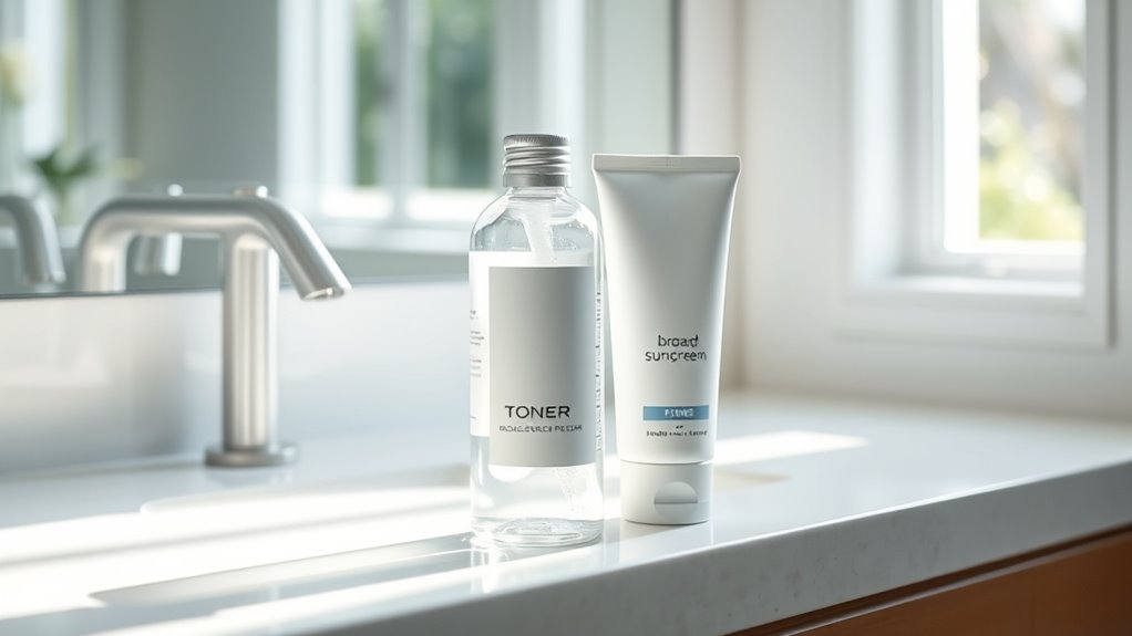 To get the order right, apply your toner first after cleansing to balance your skin and prepare it for absorption. Wait a few minutes until it fully dries and absorbs before moving on to sunscreen, which should be the final step during the day for maximum protection. Applying sunscreen immediately after toner can reduce effectiveness or cause irritation. Keep going to discover more tips on timing and layering for the best skincare results.