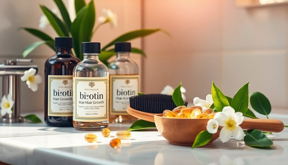 Choosing the right biotin hair growth products means considering your specific hair concerns. If you're dealing with hair thinning or breakage, look for products that contain biotin, as it's essential for promoting hair strength and growth. I've found that combinations of biotin, collagen, and keratin can markedly enhance hair health and elasticity, which is great for improving texture and tackling damage.