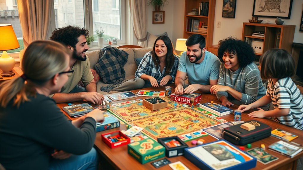 Looking for the best family board games that will bring laughs and keep everyone engaged? I recommend fun options like Jenga for suspense, Sorry! for family bonding, and Blank Slate for creative wordplay. Classic games like Connect 4, Spoons, and UNO also add lively, interactive fun. These games are simple, quick to learn, and perfect for all ages. Keep exploring for a list of top picks that guarantee memorable, laughter-filled evenings together.