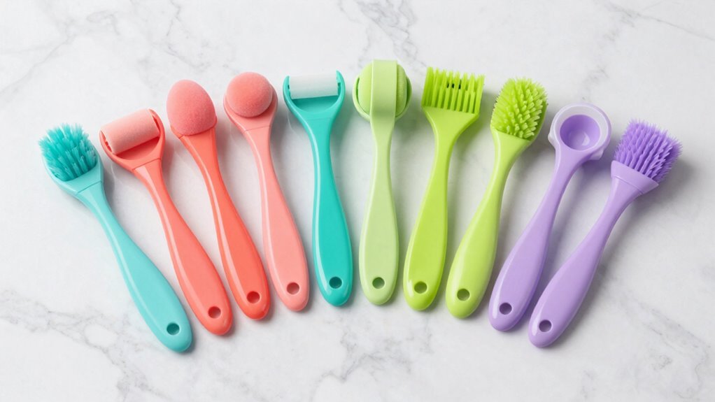 A body lotion applicator with easy-to-clean features makes maintaining hygiene simple and hassle-free. I look for tools with smooth, non-porous surfaces like plastic or sealed foam, which prevent dirt and bacteria buildup. Removable, washable pads or rollers are a must—they make thorough cleaning quick and easy after each use. Handles made from water-resistant materials such as treated wood or durable plastic are easier to rinse and won’t warp or degrade over time. I also prefer simple designs with minimal crevices or textured areas, as these reduce spots where lotion, dirt, or bacteria can hide. Features like a hanging loop or lanyard are helpful for air drying, preventing mold or odors and keeping the tool fresh and hygienic for repeated use.