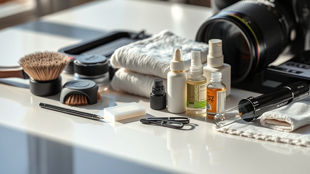 When it comes to maintaining the clarity and performance of mirrorless and DSLR camera lenses, a reliable cleaning kit is essential. I recommend one that includes key tools like a dust blower, microfiber cloth, lens pen, and cleaning fluids. These help remove dust, smudges, and fingerprints without scratching surfaces. Using proper techniques—like spraying cleaner onto a cloth and avoiding direct contact with lenses—protects your gear. A portable case keeps everything organized and ready for outdoor shoots or studio work. Overall, investing in a thorough kit ensures your lenses stay spotless, delivering sharp images every time.