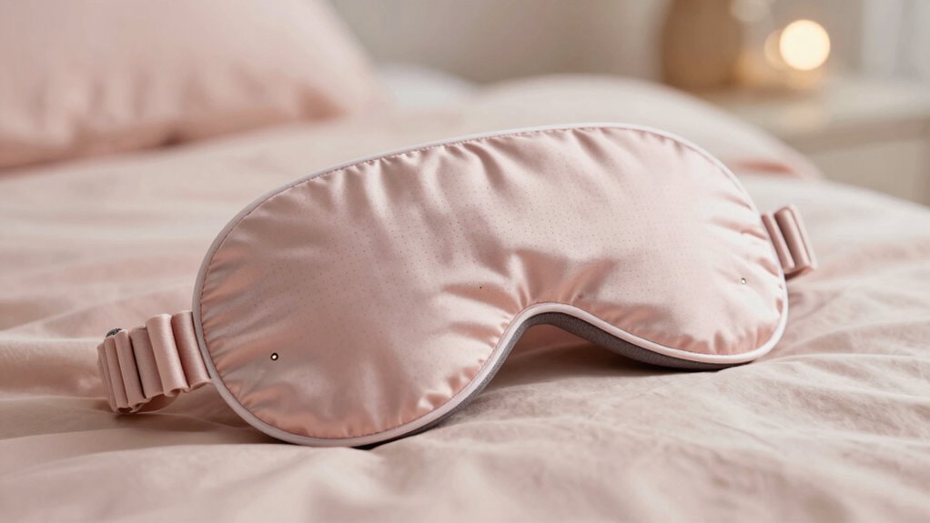 To guarantee restful sleep, effective light blocking is crucial, and this depends on how well the eye mask covers your eyes and prevents light from seeping in. A well-designed mask fully covers your eyes and uses materials that block out light completely. Contoured or 3D shapes create a seal around your eyes, reducing ambient light intrusion. Adjustable straps help ensure a snug fit, minimizing gaps where light could leak in. Materials like blackout fabric, thick padding, or specialized layers are necessary for preventing stray light from disturbing your rest. Additional features like nose bridges or sealable edges can enhance darkness, especially for those sensitive to light. Prioritizing these elements helps create a truly dark environment, fundamental for quality sleep and maximum cooling performance.