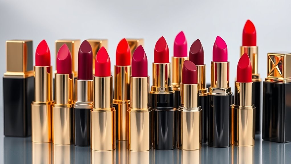 The finish type of a lipstick can dramatically influence your overall look and how long the color lasts throughout the day. When choosing a designer collection, you’ll find options like matte, satin, gloss, shimmer, metallic, and cream finishes, each offering a different vibe. Matte finishes provide a velvety, non-reflective surface that lasts long and gives a bold, sophisticated look—perfect for making a statement. Satin finishes strike a balance with a smooth, slightly glossy appearance, ideal for everyday wear. Glossy and shimmer finishes add a luminous shine, making your lips look radiant and youthful. Metallic finishes take things up a notch with reflective, pearlescent particles, creating eye-catching effects suited for special occasions. Picking the right finish depends on your style and the statement you want to make.