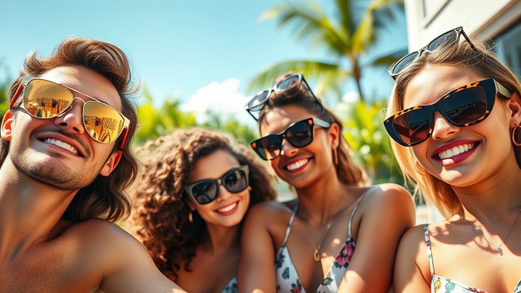 Selecting a frame style that suits your face shape can elevate your summer look while guaranteeing comfort and functionality. For example, square frames complement round faces, adding structure, while oval frames soften angular features. It’s also smart to choose versatile shapes that work across various outfits and occasions, offering better value for your investment. Balance fashion and function by picking styles that provide good coverage and UV protection while matching your personal aesthetic. Pay attention to size and proportions—oversized glasses can look bold but may overwhelm smaller faces, whereas smaller frames suit delicate features better. Sticking to classic or timeless designs helps guarantee your sunglasses stay stylish season after season, avoiding fleeting trends that might quickly go out of fashion.