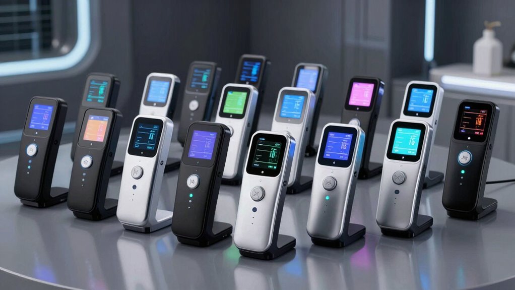 Choosing a digital skin moisture analyzer that’s portable and compact makes testing more convenient, especially if you’re on the go. Ideally, it should be around 6 to 7 inches long for easy handling and storage. A lightweight device, under 200 grams, ensures comfort during extended use or quick checks. Pocket-sized models are perfect for travel, home, or professional settings, as they fit easily into bags, pockets, or small compartments. A slim profile enhances portability without sacrificing functionality. Durability is also key—a sturdy, ergonomic design helps the device withstand frequent transport and use. When size and portability are prioritized, you gain the flexibility to monitor skin moisture levels conveniently anytime and anywhere, making consistent skincare routines more achievable.