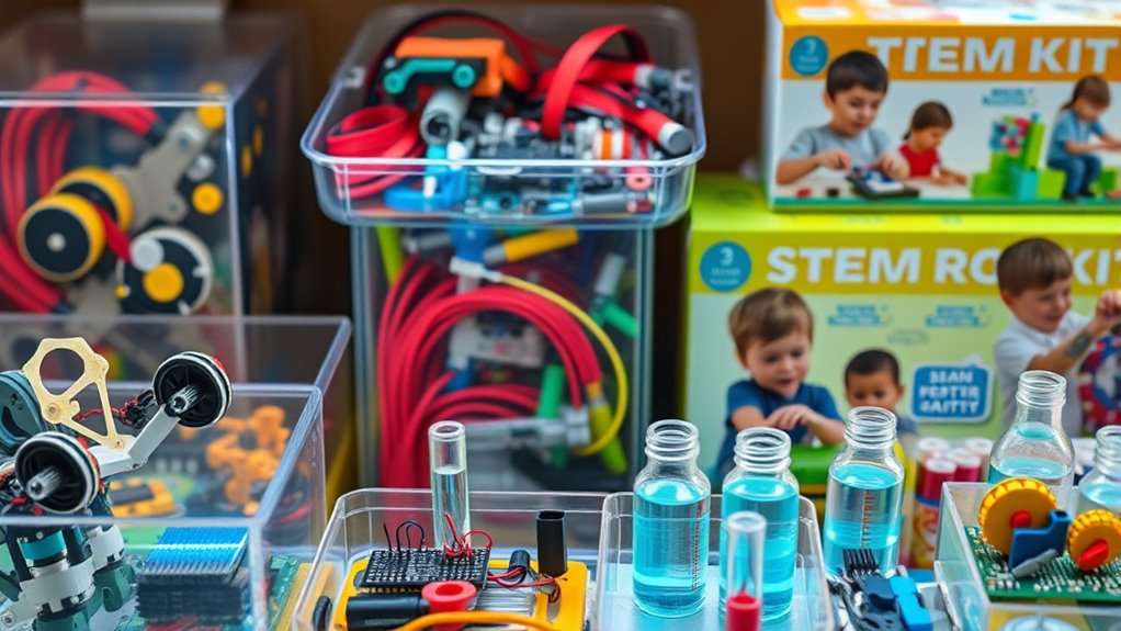 I find that many STEM kits include safety features like rounded edges, non-toxic materials, and secure compartments to prevent choking hazards. Some kits also have clear instructions and warnings to guarantee proper use, which I appreciate. I always check for age-appropriate labels and adult supervision recommendations. These features help me feel confident that my child can explore and learn safely while having fun with their STEM activities.