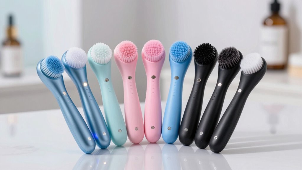 A facial cleansing brush that’s easy to clean helps me keep my skincare routine hygienic and hassle-free. I prefer devices with silicone or soft bristle heads because they rinse quickly and dry fast, reducing bacteria buildup. Removable brush heads are a must—after each use, I wash them thoroughly with soap and water to stay fresh. I steer clear of brushes with complex parts or hard-to-reach areas, as they trap dirt and make cleaning a chore. Waterproof or water-resistant designs give me peace of mind, allowing me to clean the entire device without worry. To maintain *best* hygiene, I replace the brush heads regularly, following the manufacturer’s recommendations. This simple approach keeps my skin clean, healthy, and free from bacteria.