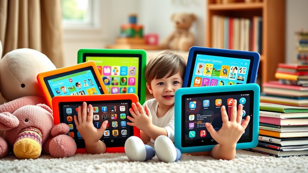 If you’re looking for the best Fire HD tablets for kids that are safe, durable, and packed with fun content, I’ve got you covered. The top options include the Fire HD 10 Kids Pro, which offers a vibrant display, tough design, and parental controls, along with bundles that add extra value. These models are built tough for active use and include a year of Amazon Kids+. Keep exploring to find the perfect device that suits your child’s needs.