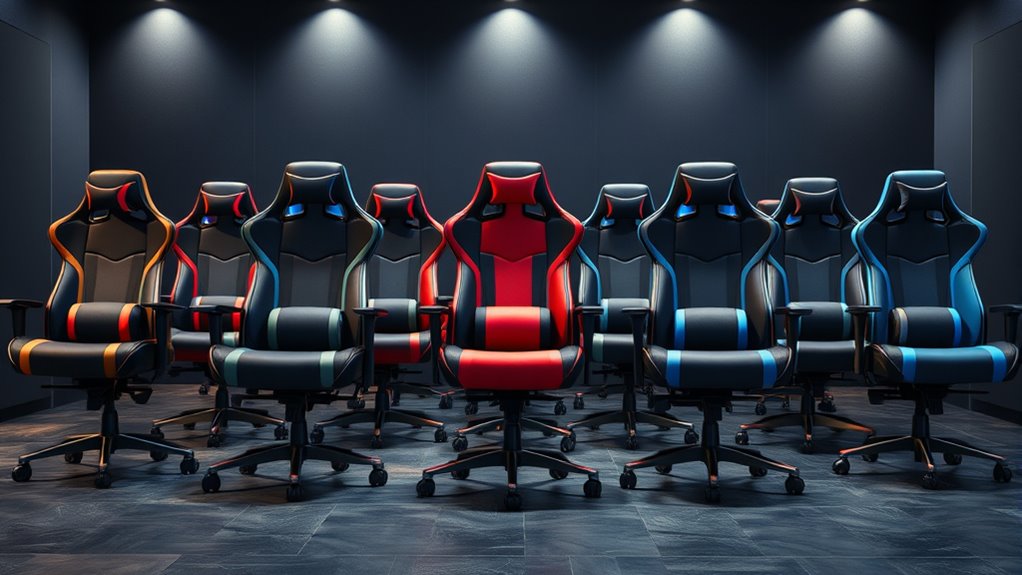 The seat comfort level is crucial for an enjoyable gaming experience, especially during long sessions. A supportive seat cushion made from high-density foam ensures lasting resilience and comfort, preventing fatigue over hours of play. Breathable materials like PU leather or mesh improve airflow, reducing heat buildup and keeping you cooler. Ergonomic contours that match the body’s natural curves help distribute pressure evenly, minimizing soreness and fatigue. Adjustable features like seat height and tilt allow customization for ideal posture and spinal alignment. Padded armrests and lumbar support pillows further enhance comfort by alleviating pressure points and supporting the lower back. Combining these elements ensures a seat that’s both comfortable and conducive to extended gaming, helping you stay focused and comfortable no matter how long you play.