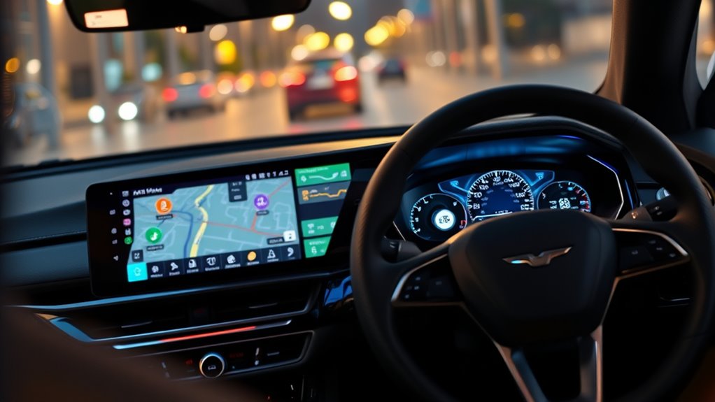 Choosing a GPS navigation system with versatile connectivity options can markedly enhance my driving experience. Bluetooth allows me to make hands-free calls and stream audio, keeping me safe and connected on the road. Wi-Fi and cellular support enable real-time traffic updates and quick map downloads, so I always have the latest data without relying solely on preloaded maps. FM transmitters come in handy by broadcasting GPS instructions directly to my car’s stereo, making directions clearer and louder. Some advanced systems support wireless mirroring and integrate seamlessly with smartphone apps like CarPlay or Android Auto, providing a smooth connection to my phone’s features. These options not only improve communication but also add convenience and entertainment, ensuring I stay informed and entertained on every journey.