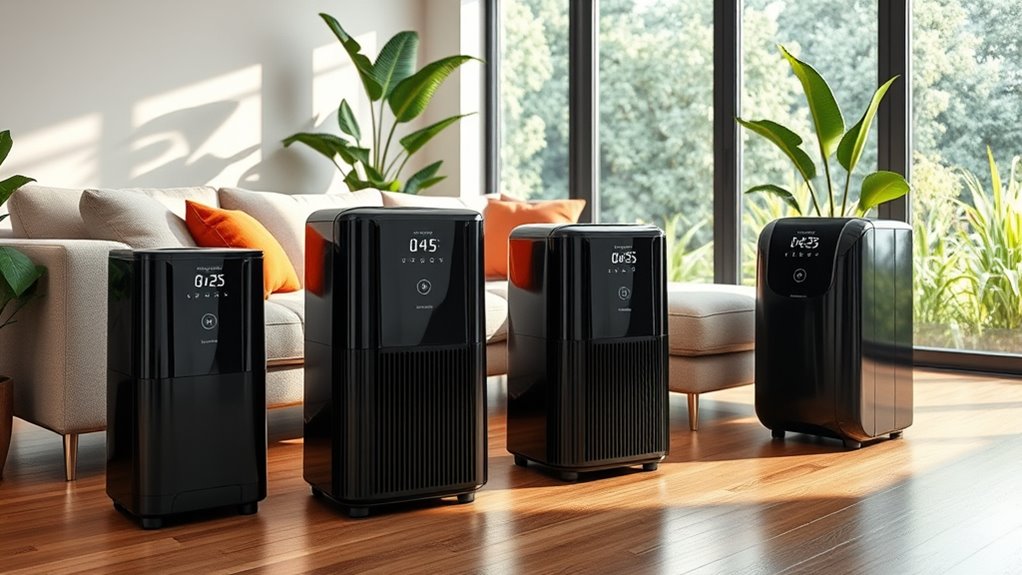 Many top-tier air purifiers now come equipped with smart features that make managing indoor air quality more convenient. Wi-Fi connectivity lets me control and monitor my purifier remotely via smartphone apps, giving real-time updates and alerts. Sensors automatically adjust fan speeds based on air quality, ensuring ideal purification without constant manual adjustments. Compatibility with voice assistants like Alexa or Google Assistant allows for hands-free operation, seamlessly integrating the purifier into my smart home ecosystem. Advanced models provide real-time air quality data, filter status updates, and maintenance alerts through app notifications, helping me stay on top of performance and schedule filter replacements. These smart features not only enhance convenience but also ensure my indoor air remains clean and allergen-free with minimal effort.