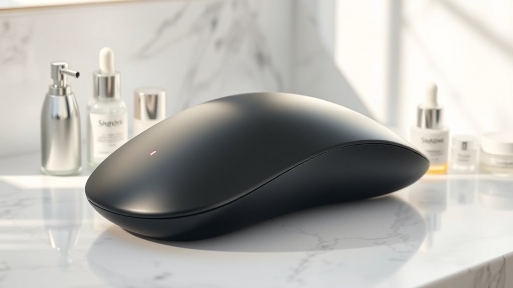 When evaluating high-end facial cleansing devices, ease of use and portability are crucial factors that can markedly impact your skincare routine. A user-friendly device should have intuitive controls and clear indicators, making it simple to operate without guesswork. Compact, lightweight designs enhance portability, allowing you to seamlessly incorporate your device into travel or outdoor activities. Wireless charging or quick recharge features reduce downtime and boost convenience, especially when you’re on the move. An ergonomic handle with a non-slip surface ensures a secure grip, even with wet or oily hands. Additionally, compatibility with travel accessories like cases or stands makes storage and transport easy without sacrificing hygiene. These features ensure your cleansing device remains practical and effective, wherever your skincare journey takes you.