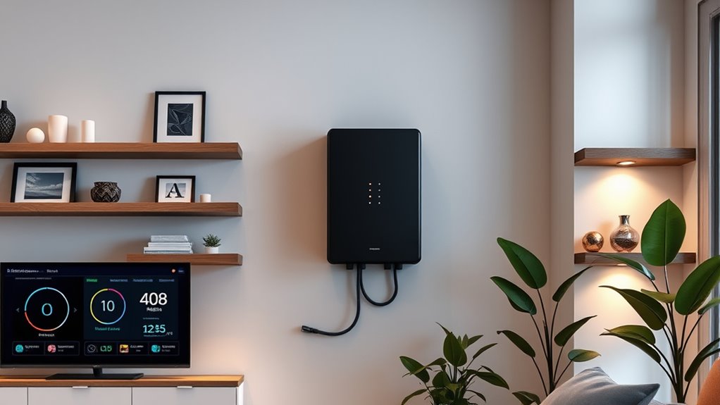 Management features play a crucial role in guaranteeing my high-end home battery backup system operates smoothly and efficiently. Real-time monitoring dashboards give me instant updates on battery status, load levels, and system health, so I stay informed. Advanced systems can automatically start or shut down to optimize energy use and guarantee seamless power during outages. Customizable alarms and notifications alert me to battery issues or power anomalies via mobile or desktop apps, allowing quick responses. Integration with home automation systems enables centralized control and scheduling of backup operations, making energy management effortless. Some systems even support firmware updates and remote management, so I can optimize performance and troubleshoot issues without needing physical access. These features provide peace of mind and maximize my system’s reliability.