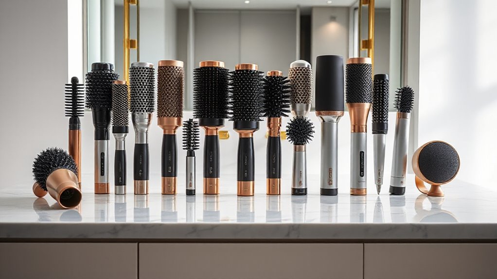 Since versatility is a key benefit of high-end hot air brushes, I look for models that combine multiple functions into one device. These tools should seamlessly handle drying, straightening, curling, and volumizing, allowing me to create various looks without switching devices. The ability to swap between attachments like barrels and brushes expands styling options, making it easier to achieve different textures and shapes. Advanced models often include features like ionic emission and ceramic coatings, which improve results and minimize damage across all functions. Multiple heat and speed settings give me precise control, suited to my hair type and preferred style. Some high-end brushes even have interchangeable or adjustable heads, accommodating different hair lengths and textures effortlessly.