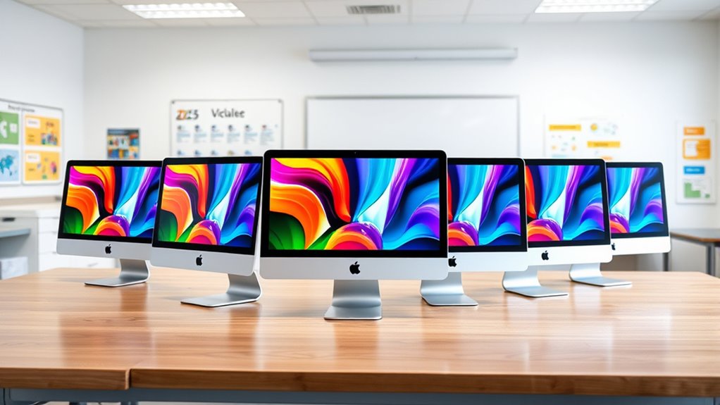 Imagine a sleek, silent guardian quietly saving energy as it works—that’s how efficient the latest iMac models are for classrooms. They use advanced power management and eco-friendly components, consuming less energy without sacrificing performance. So, I find these iMacs not only boost learning but also help reduce our environmental footprint, making them a smart choice for eco-conscious schools aiming to balance technology and sustainability effortlessly.