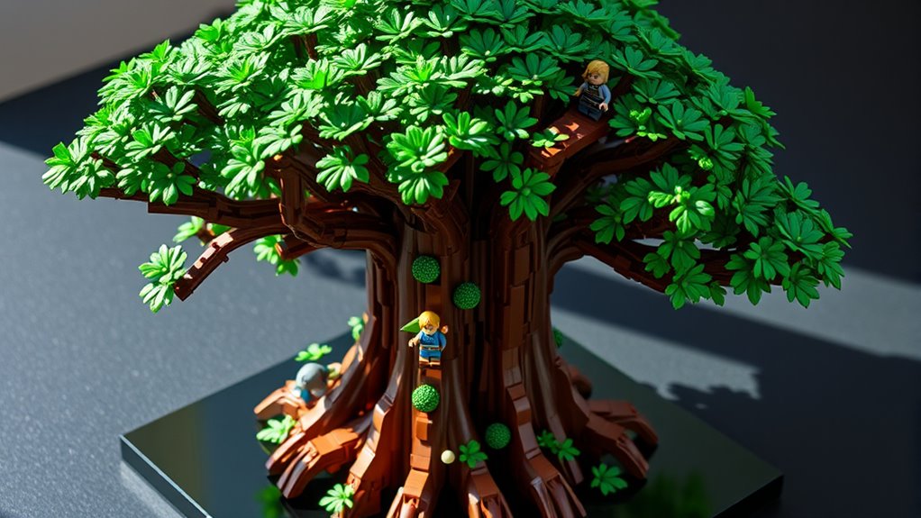 Since aesthetic and theme alignment greatly enhance the overall appeal of a Lego Zelda Great Deku Tree set, it’s important to contemplate how well the design matches your personal taste and existing collection. The set’s color scheme and style should reflect your preferred Zelda game version or aesthetic sensibilities. Look for detailed, accurate depictions of iconic characters and elements from The Legend of Zelda series to ensure authenticity. Consider if the theme complements your current Zelda display or collection. Features like glow effects or poseability can boost its thematic charm. Ultimately, evaluate whether the artistic style aligns with your decorative preferences, helping the set seamlessly integrate into your Zelda environment and enhancing overall visual harmony.