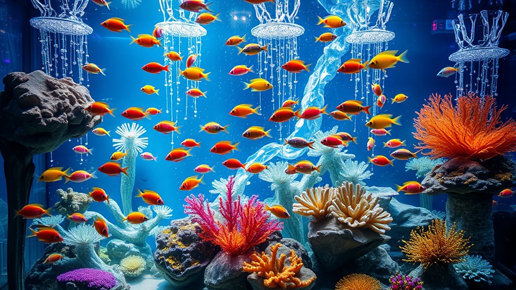 Luxury aquarium accessories benefit fish health and behavior by creating a more natural, stimulating environment. I’ve found that high-quality decor and advanced filtration reduce stress, promote natural instincts, and improve water quality. These accessories also encourage activity and exploration, which keeps fish engaged and healthy. Investing in these luxurious features not only enhances the tank’s beauty but also guarantees my fish thrive in a safe, comfortable space.