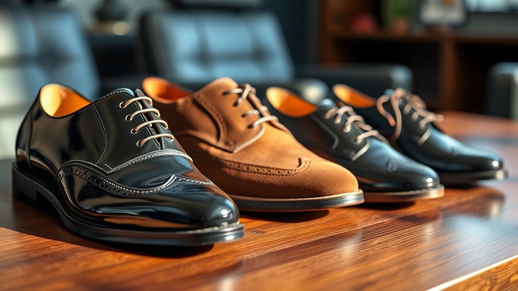 When selecting luxury men’s dress shoes, durability and maintenance play a crucial role in preserving their value and appearance over time. High-quality leather and sturdy sole construction are key for lasting wear. Regular cleaning and conditioning keep the leather supple and looking fresh, while proper storage prevents creases and damage. Shoes with reinforced stitching and durable hardware are less prone to daily wear and tear. Investing in models with replaceable insoles and soles can considerably extend their lifespan and comfort. Additionally, proper drying and avoiding excessive exposure to water or extreme temperatures are essential to prevent material deterioration. Taking these steps ensures your shoes stay in top condition, maintaining both their appearance and functionality for years to come.