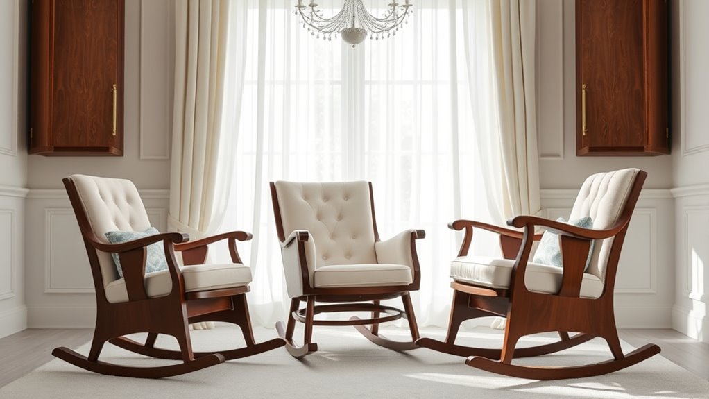 Think of design styles as the language that brings your nursery decor to life. I choose chairs that echo the theme—be it modern, rustic, or whimsical—so everything feels harmonious. A sleek, minimalist chair pairs well with contemporary decor, while a plush, vintage-inspired piece complements a cozy, traditional space. The key is selecting a rocking chair that seamlessly blends with your theme, creating a sanctuary that’s both stylish and soothing.