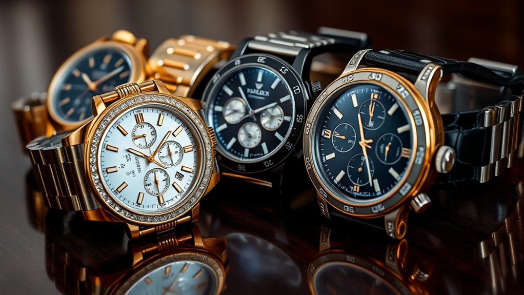 Luxury watches retain value over time because they’re crafted with high-quality materials and exceptional craftsmanship, making them durable and desirable. I’ve noticed that limited editions or vintage pieces can appreciate as collectors seek them out. Proper care and maintaining original boxes and papers also boost their worth. So, if you invest in a reputable brand, you’re more likely to see your watch hold or grow its value over the years.