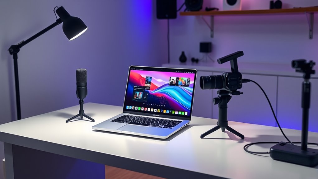Ecosystem compatibility is vital because it allows seamless integration between your MacBook Pro and other Apple devices, simplifying content sharing and control during live streams. Features like iPhone Mirroring and AirDrop make transferring media quick and effortless, reducing workflow disruptions. macOS’s native support for Continuity and Handoff enables smooth multitasking and easy switching between devices, which is indispensable during content creation and live streaming. Compatibility with Apple-specific hardware like AirPods and Studio Display enhances both audio and visual quality, guaranteeing professional-grade output. Plus, ecosystem integration helps manage apps, notifications, and security centrally, boosting efficiency during broadcasts. Prioritizing ecosystem compatibility ensures your setup remains cohesive, responsive, and streamlined—key factors in delivering high-quality live streams and content.