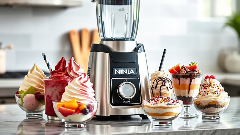 How do flavor variety options influence the selection of Ninja Creami Deluxe recipes? They notably expand creative possibilities, allowing users to explore everything from classic vanilla and chocolate to exotic fruit and herbal infusions. Diverse flavor profiles cater to various dietary needs, including vegan, low-sugar, and dairy-free options, making the recipes more inclusive. Seasonal and themed flavors keep the experience fresh and exciting throughout the year. Incorporating mix-ins like candies, nuts, and swirls adds texture and enhances flavor complexity. A broad recipe collection balances simple everyday flavors with gourmet choices for special occasions. Overall, variety options ensure there’s something for everyone, encouraging experimentation and making the frozen treat experience more enjoyable.
