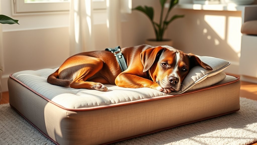 Choosing the right supportive foam is crucial because it directly impacts your pet’s comfort and joint health. High-density foam, like memory foam or egg crate, offers better support and pressure relief, especially for pets with joint or arthritis issues. The foam should be resilient, bouncing back quickly to maintain consistent support over time. Foam density, measured in pounds per cubic foot (PCF), indicates durability; higher PCF means a firmer, more durable mattress. The thickness of the foam layer, usually between 2 to 4 inches, affects comfort and how well pressure on joints is distributed. It’s also essential to choose foam that’s CertiPUR-US certified or similar, ensuring it’s free from harmful chemicals and safe for your pet’s health.