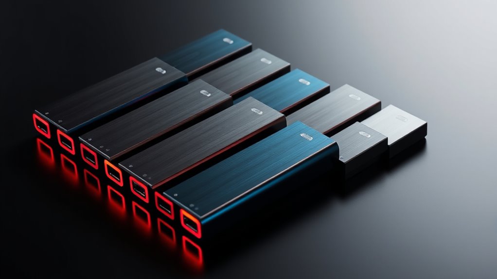 Choosing the right connection interface is key to maximizing your portable SSD’s speed and performance. USB 3.2 Gen 2 offers transfer speeds up to 10Gbps, providing faster performance than older USB standards. Thunderbolt 3 and 4 deliver incredible speeds up to 40Gbps, ideal for demanding workflows and large file transfers. USB-C connectors are reversible and compatible with most modern devices, supporting high-speed data transfer when paired with appropriate ports and cables. NVMe over USB can push speeds beyond 1,000MB/s, but you’ll need compatible host devices and cables to realize this potential. Supporting multiple standards like USB-A, USB-C, and Thunderbolt adds versatility but can influence maximum transfer speeds based on port capabilities. Choosing the right interface guarantees you get the speed you need for professional and everyday use.