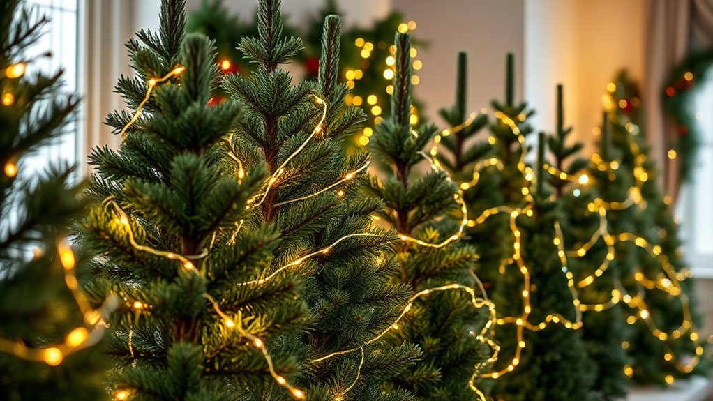 Selecting the right size for your pre-lit Christmas tree is essential to creating a balanced and functional holiday display. I always start by measuring my ceiling height and floor space to verify the tree fits comfortably without blocking walkways or doorways. It’s important to contemplate the tree’s width too, so it complements the room’s dimensions and leaves enough space for ornaments and decorations. If you have limited space, a smaller tree, around 4.5 to 6 feet, works well, but it might limit your decorating options. For larger rooms, a 9 to 12-foot tree makes a dramatic statement but needs a sturdy base and more support. Proper sizing helps your tree look festive without overwhelming the room or compromising safety and accessibility.