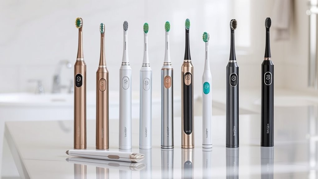 Choosing a premium electric toothbrush means prioritizing cleaning effectiveness, which can drastically improve your oral health. These brushes can remove up to 20 times more plaque than manual ones, making a significant difference. Sonic models deliver high-frequency vibrations, typically between 31,000 and 50,000 VPM, helping to dislodge plaque and debris more efficiently. Oscillating-rotating brushes use targeted movements that enhance plaque removal, especially along gumlines and hard-to-reach areas. Many premium brushes also include smart timers and quadrant alerts, ensuring you brush for the recommended two minutes and evenly across all sections of your mouth. Additionally, advanced pressure sensors prevent excessive force, reducing gum damage while maintaining high cleaning performance. These features collectively ensure a superior, thorough clean every time.