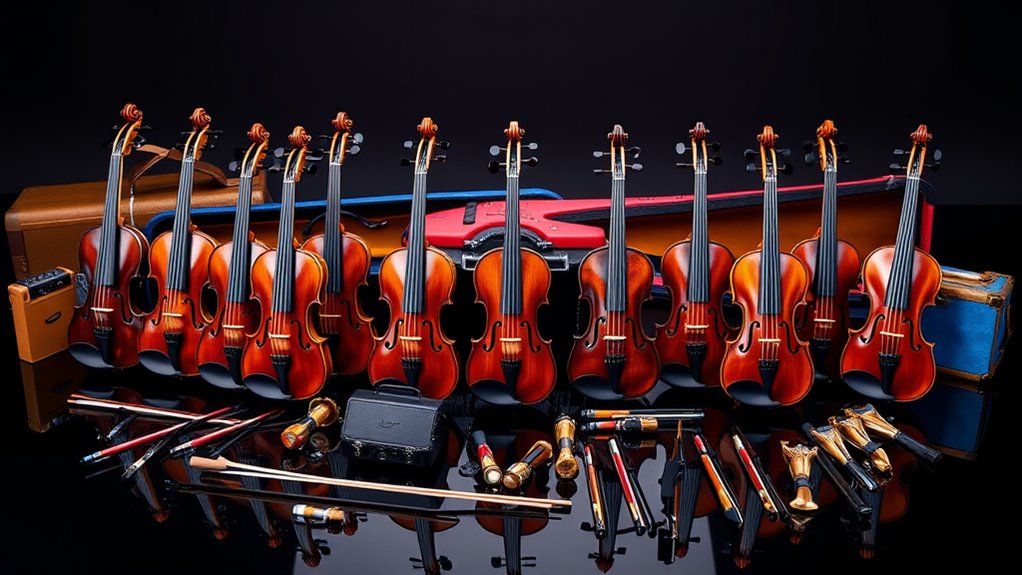 Back in the day, a trusty tuner was a must-have, and I still recommend one for premium electric violins. Besides that, I recommend a high-quality bow, a sturdy case, and extra strings for versatility. A good shoulder rest helps with comfort during long practice sessions. These accessories guarantee your violin sounds its best and stays protected, making your musical journey smoother and more enjoyable.