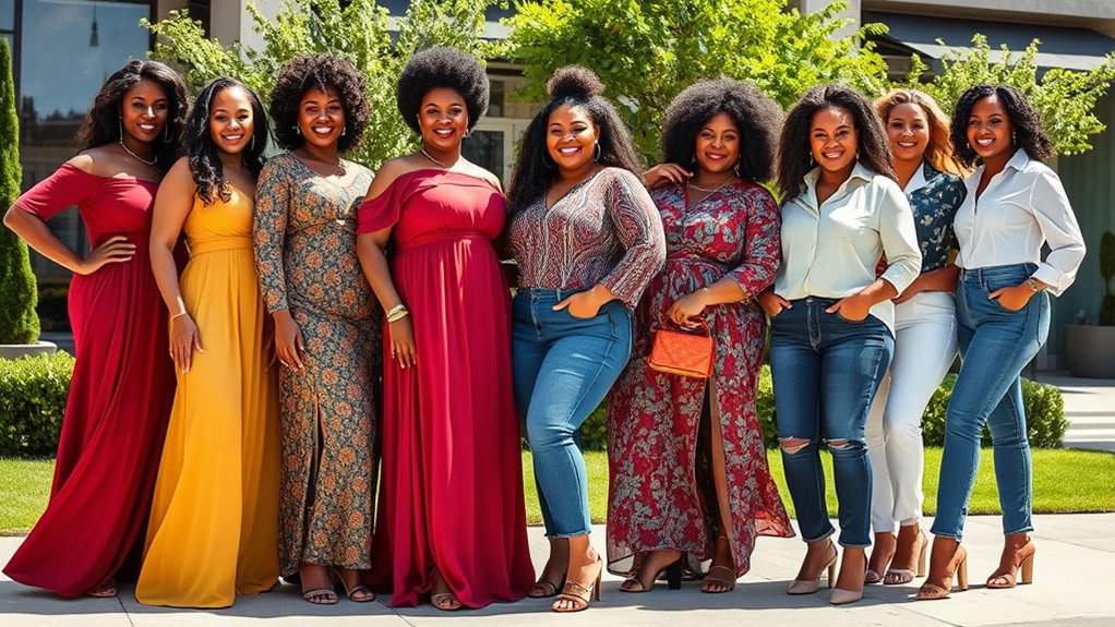 Selecting the right colors and patterns can considerably elevate your plus-size wardrobe by reflecting your personal style and enhancing your overall look. Bright, vibrant hues can boost your confidence and add energy to your outfits, while neutral tones offer timeless versatility and sophistication. When choosing patterns like stripes, florals, or geometric designs, consider how they can create visual interest and help balance your proportions. Keep in mind the occasion—subtle patterns work well for professional settings, while bold prints are perfect for casual or festive events. Additionally, think about how your chosen colors and patterns will coordinate with your existing wardrobe to ensure maximum versatility. Ultimately, choosing colors and patterns that resonate with your style makes dressing both enjoyable and effortless.