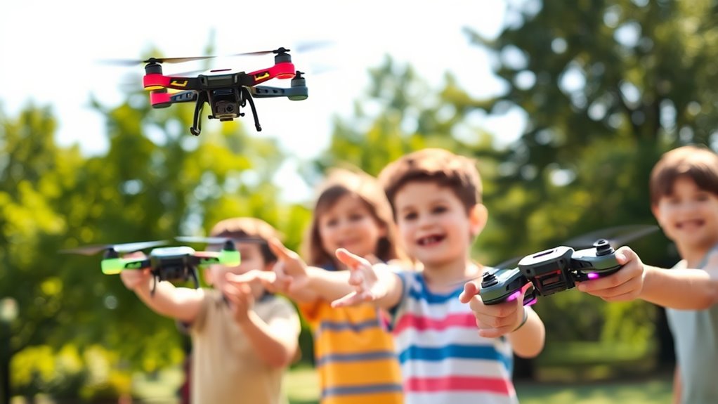 Flight stability and control are essential for ensuring that kids can fly their drones confidently and safely. Features like altitude hold and gyroscopic stabilization help keep the drone steady, making hovering easier for beginners. Precise control responsiveness is equally important for accurate maneuvers; this can be measured by control range and how quickly the drone reacts to commands. Multiple speed modes allow children to start slow and gradually increase their skills. Additionally, headless mode simplifies orientation, aligning controls with the pilot’s perspective, reducing confusion during complex moves. Responsive control systems with low-latency communication and stabilization sensors boost overall control, giving kids confidence and making flying more enjoyable. These features ensure a smoother, safer experience for young pilots learning the ropes.