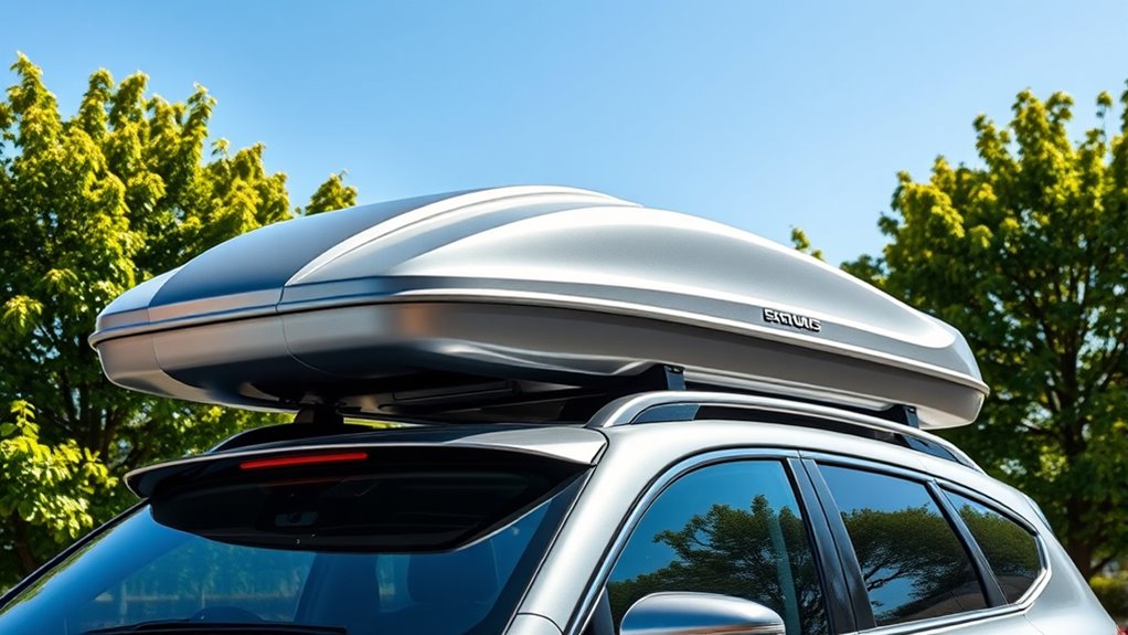 An aerodynamic design offers numerous advantages that can substantially enhance your driving experience. It reduces wind resistance and drag, which can lead to better fuel efficiency on long trips. The streamlined shape minimizes wind noise and turbulence, making highway driving quieter and more comfortable. Additionally, an aerodynamic roof cargo box decreases the overall wind load on your vehicle, improving stability and safety, especially at higher speeds. Properly contoured designs also prevent water from pooling and reduce the risk of leaks during rain or car washes. Plus, a sleek, streamlined profile contributes to better handling and puts less strain on your roof mounting system. Overall, choosing an aerodynamic cargo box not only boosts your vehicle’s performance but also guarantees a smoother, quieter ride.