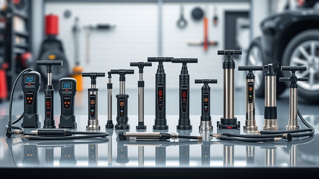If you’re looking for the best premium tire inflators and pumps, I suggest focusing on models with fast inflation times, digital pressure gauges, multiple power options, and reliable safety features like auto shut-off. Portable and lightweight units with durable construction make roadside emergencies easier. Top-rated options often combine high airflow rates with user-friendly designs, LED lighting, and long-lasting batteries. Keep exploring; I’ll help you find the perfect device tailored to your needs.